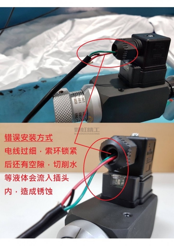 如圖為臺(tái)肯壓力開(kāi)關(guān)錯(cuò)誤的安裝方式,切削水等液體會(huì)沿著電線(xiàn)流下,造成電器插頭及微動(dòng)開(kāi)關(guān)銹蝕.