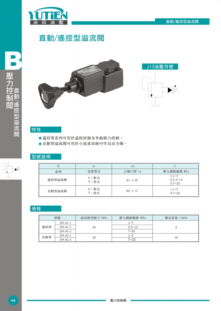 YUTIEN直動式溢流閥常規(guī)型號參考:DG-02-1 , DG-02-3 ,DT-02-1 , DT-02-3 ,