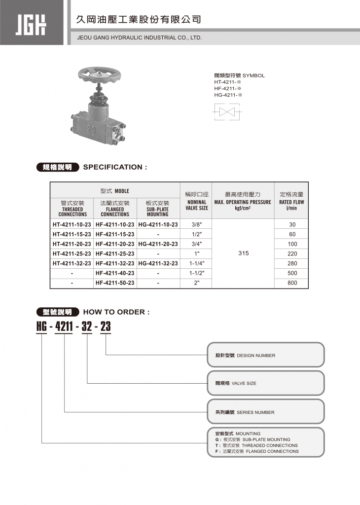 規(guī)格說明 型式 稱呼口徑 最高使用壓力 kgf/cm2 定格流量 l/min 管式安裝 法蘭式安裝 板式安裝 HT-4211-10-23 HF-4211-10-23 HG-4211-10-23 3/8” 315 30 HT-4211-15-23 HF-4211-15-23 ?– 1/2” 60 HT-4211-20-23 HF-4211-20-23 HG-4211-20-23 3/4”