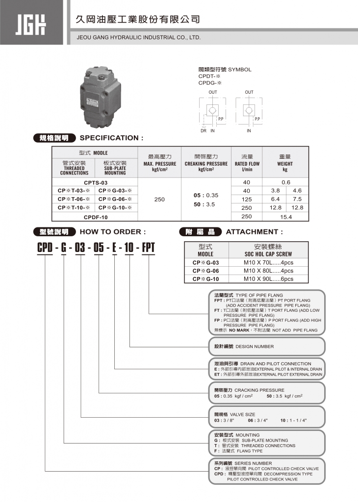 規(guī)格說明 型式 最高使用壓力 kgf/cm?2 開啟壓力 kgf/cm?2 流量 l/min 重量 kg 管式安裝 板式安裝 CPTS-03 250 05 :0.35 50 :?3.5 40 0.6 CP※T-03-※ CP※G-03-※ 40 3.8 4.6 CP※T-06-※ CP※G-06-※ 125 6.4 7.5 CP※T-10-※ CP※G-10-※ 250 12.8 12.8 CPD