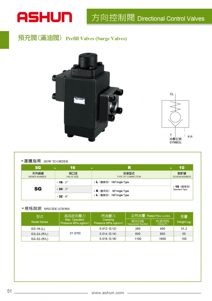 ASHUN預(yù)充閥(滿油閥)常規(guī)型號參考:SG-16-L-10 , SG-24-R-10 , SG-24-L-10 , SG-32-R-10 , SG-32-L-10