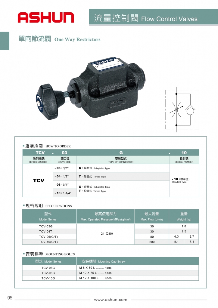 ASHUN單向節(jié)流閥常規(guī)型號(hào)參考:TCV-03G-10 , TCV-04T-10 , TCV-06G-10 , TCV-06T-10 , TCV-10G-10 , TCV-10T-10