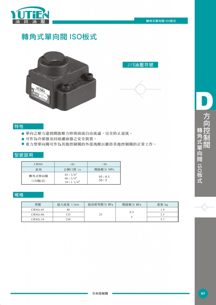 YUTIEN油田方向控制閥 CRNG系列轉(zhuǎn)角式單向閥 ISO板式