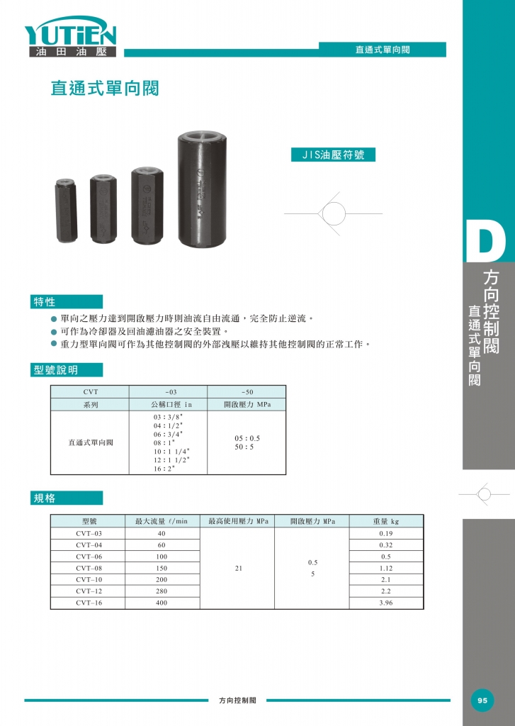 YUTIEN直通式單向閥部分常規(guī)型號(hào)參考:CVT-03-05 , CVT-03-50 , CVT-04-05 , CVT-04-50 , CVT-06-05 , CVT-06-50 , CVT-08-05 , CVT-08-50 , CVT-10-05 , CVT-10-50 , CVT-12-05 , CVT-12-50 , CVT-16-05 , CVT-16-50