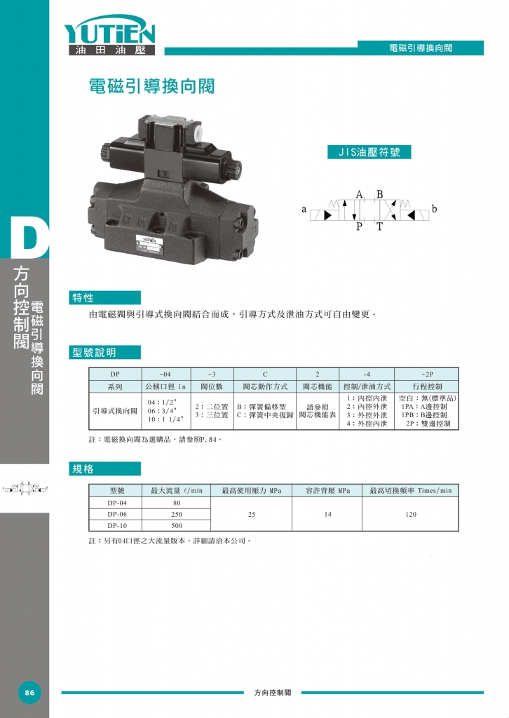 YUTIEN電磁引導(dǎo)換向閥部分常規(guī)型號參考:DP-04-2B12A-1-2P , DP-04-2B12A-2-2P , DP-04-2B12A-3-2P , DP-04-2B12A-4-2P , DP-04-2B2-1-2P , DP-04-2B2-2-2P , DP-04-2B2-3-2P , DP-04-2B2-4-2P , DP-04-2B2B-1-2P , DP-04-2B2B-2-2P , DP-04-2B2B-3-2P , DP-04-2B2B-4-2P , DP-04-3C12-1-2P , DP-04-3C12-2-2P , DP-04-3C12-3-2P , DP-04-3C12-4-2P , DP-04-3C2-1-2P , DP-04-3C2-2-2P , DP-04-3C2-3-2P , DP-04-3C2-4-2P , DP-04-3C60-1-2P , DP-04-3C60-2-2P , DP-04-3C60-3-2P , DP-04-3C60-4-2P , DP-06-2B12A-1-2P , DP-06-2B12A-2-2P , DP-06-2B12A-3-2P , DP-06-2B12A-4-2P , DP-06-2B2-1-2P , DP-06-2B2-2-2P , DP-06-2B2-3-2P , DP-06-2B2-4-2P , DP-06-2B2B-1-2P , DP-06-2B2B-2-2P , DP-06-2B2B-3-2P , DP-06-2B2B-4-2P , DP-06-3C12-1-2P , DP-06-3C12-2-2P , DP-06-3C12-3-2P , DP-06-3C12-4-2P , DP-06-3C2-1-2P , DP-06-3C2-2-2P , DP-06-3C2-3-2P , DP-06-3C2-4-2P , DP-06-3C60-1-2P , DP-06-3C60-2-2P , DP-06-3C60-3-2P , DP-06-3C60-4-2P , DP-10-2B12A-1-2P , DP-10-2B12A-2-2P , DP-10-2B12A-3-2P , DP-10-2B12A-4-2P , DP-10-2B2-1-2P , DP-10-2B2-2-2P , DP-10-2B2-3-2P , DP-10-2B2-4-2P , DP-10-2B2B-1-2P , DP-10-2B2B-2-2P , DP-10-2B2B-3-2P , DP-10-2B2B-4-2P , DP-10-3C12-1-2P , DP-10-3C12-2-2P , DP-10-3C12-3-2P , DP-10-3C12-4-2P , DP-10-3C2-1-2P , DP-10-3C2-2-2P , DP-10-3C2-3-2P , DP-10-3C2-4-2P , DP-10-3C60-1-2P , DP-10-3C60-2-2P , DP-10-3C60-3-2P , DP-10-3C60-4-2P