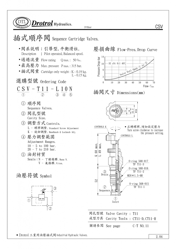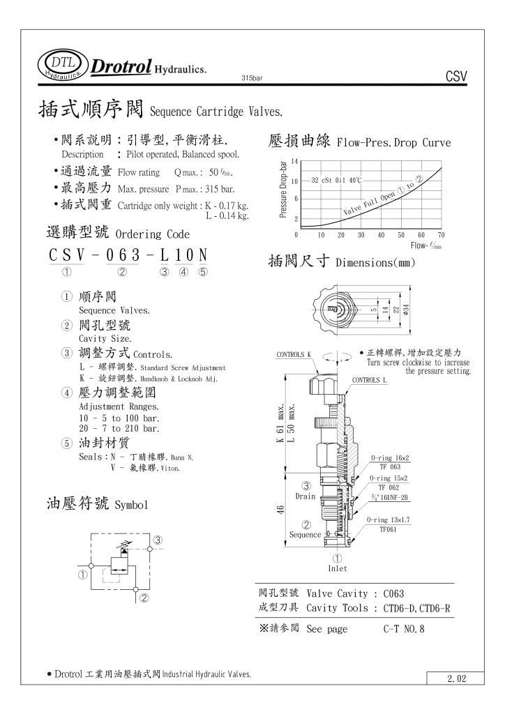 DTL插式順序閥部分常規(guī)型號參考:CSV-T02-K10N , CSV-T02-K10V , CSV-T02-K20N , CSV-T02-K20V , CSV-T02-L10N , CSV-T02-L10V , CSV-T02-L20N , CSV-T02-L20V ,