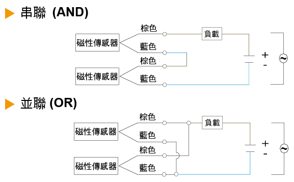 當二線式串連時,不能超過兩個磁性傳感器預定額度的內(nèi)部降壓 (內(nèi)部降壓:2.5 ~ 4V/per switch) 否則會導致負載的不動作。