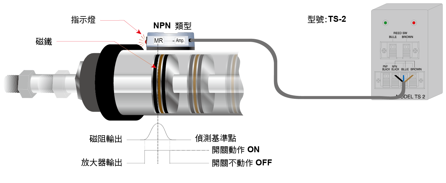 當氣壓缸動作,裝置在活塞內(nèi)的磁鐵向磁性傳感器接近時,磁性傳感器內(nèi)的磁阻將會感應到磁場的改變,并產(chǎn)生微量電壓變化。透過內(nèi)部集成電路的放大,推動晶體而導通電路。